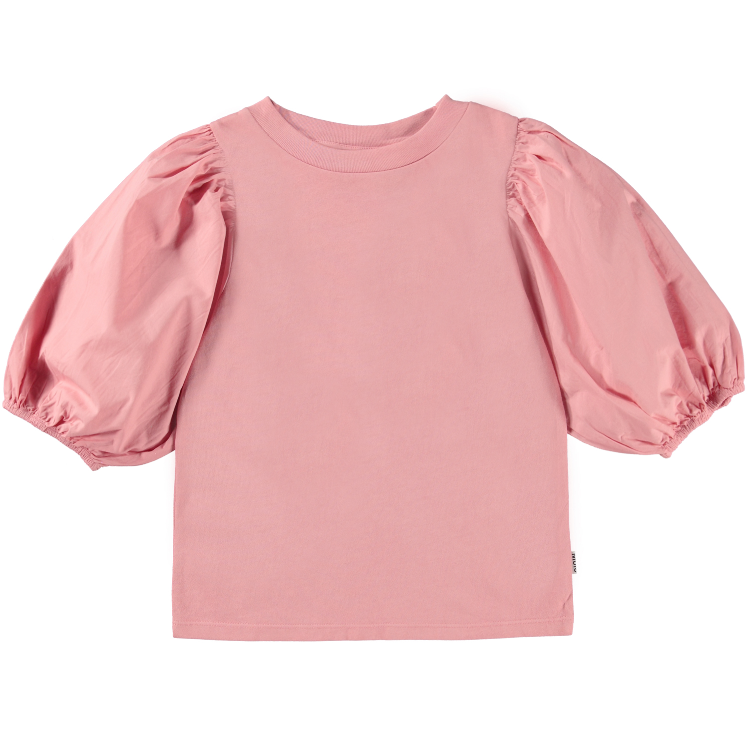 Rosa tröja med puffärmar i bomullspoplin. Denna tröja är tillverkad i 100% bomull, har en rund halsmedribbkant, korta ärmar med puff och en normal passform.