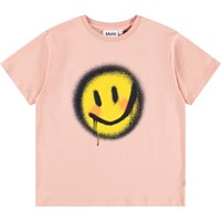 Rosa kortärmad T-shirt i mjuk ekologisk bomull med en ribbad halsringning. T-shirten har en lös passform med ett smältande leende ansikte framtill.