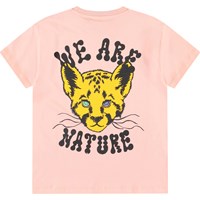 Rosa t-shirt i mjuk ekologisk bomull med korta ärmar och ribbad halsringning. T-shirten har en lös passform med en gul gepardunge och texten 'We are nature' både på bröstet och ryggen.