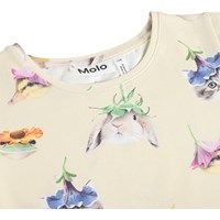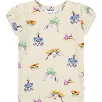 Beige figursydd T-shirt i mjuk ekologisk bomull med rund hals, små korta puffärmar och ett mönster av djur med blomsterhattar.