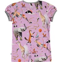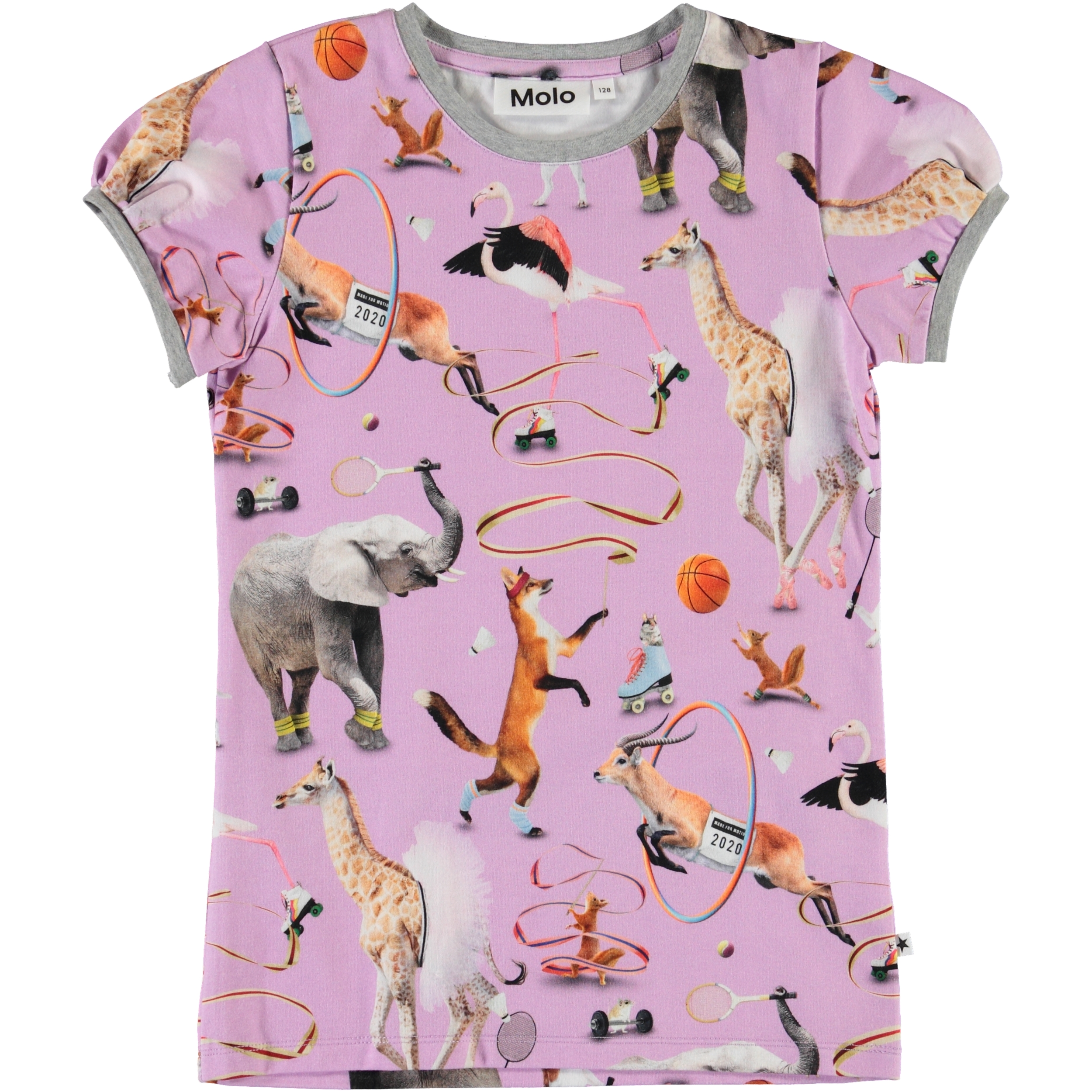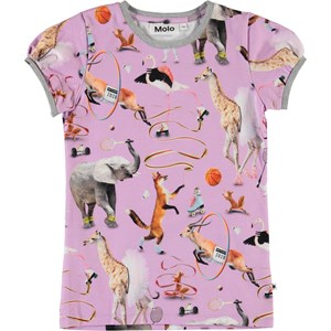 Rimona är en lila t-shirt med ett print av djur, som utövar olika typer av sporter. T-shirten har mycket korta ärmar och ett grått kantband.