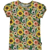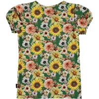 Grön t-shirt med blommigt mönster. Här ses olika blommor som t.ex. solrosor och dahlior i rosa och gula nyanser. Denna t-shirt är tillverkad i 100% bomull, har korta ärmar, rund hals med ribb och en smal passform.