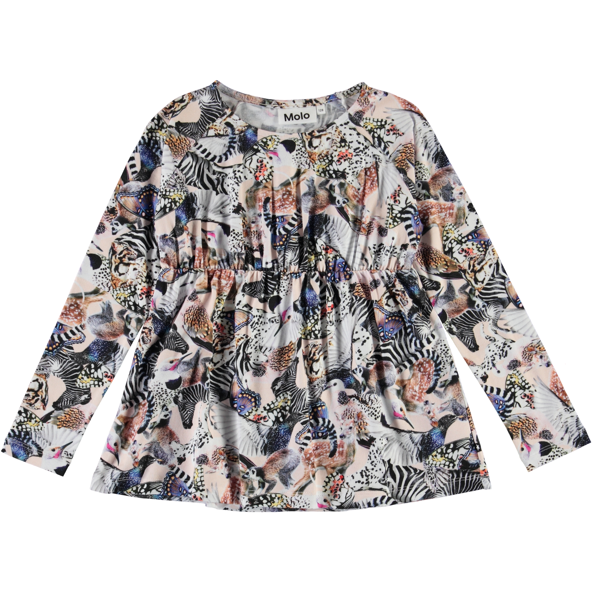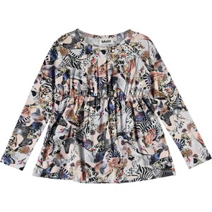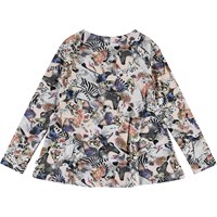 Rina är en långärmad tröja med ett all-over print med färgglada djur. Rina har resår i midjan, vilket ger ett feminint passform.