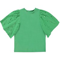 Ritza är en grön topp med vacka, korta broderi anglaise ärmar. Ärmarna rynkas uppe på axeln, vilket skapar en elegant puff-effekt. Kombinera med matchande kjol, Brigitte, för en komplett look.