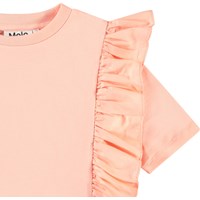 Ljusorange t-shirt i mjuk ekologisk bomull med ribbad halsringning. T-shirten har en lös passform och volangdetalj som löper över axeln och på framsidan och baksidan.