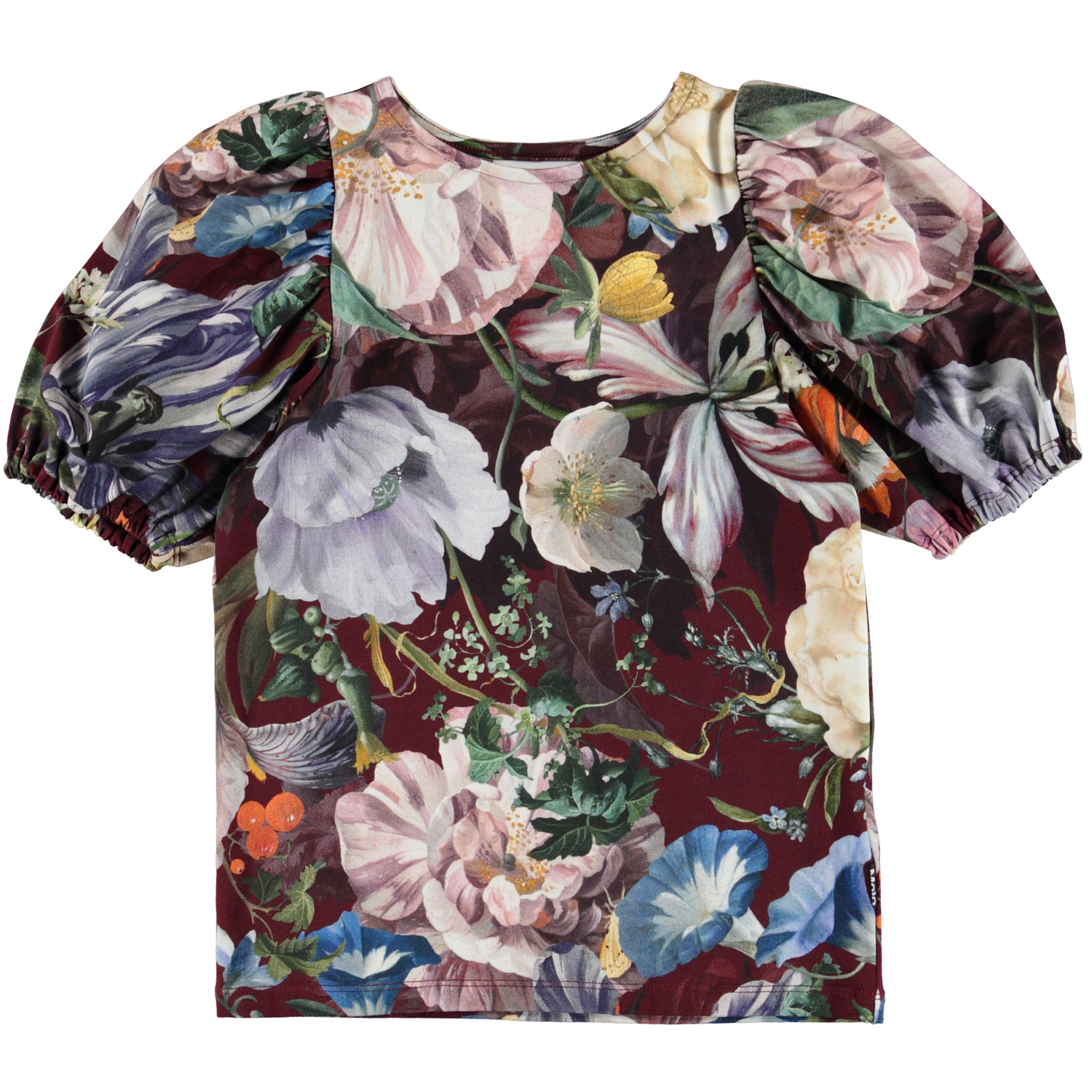 Rivera är en tröja med puffärmar i bordeauxröd med stora blommor. Tröjan har rund hals och gummiband vid ärmslut som gör att de sitter perfekt.