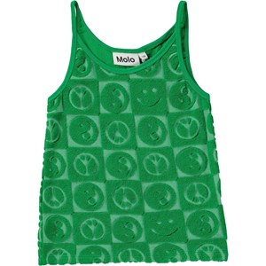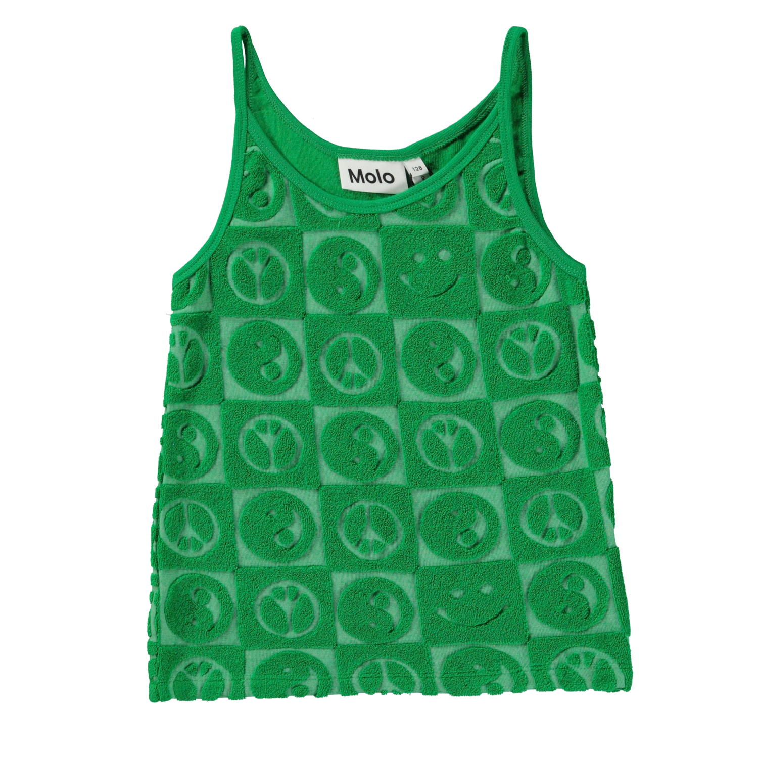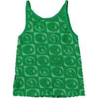Grön frotté topp i en mjuk bomullsblandning med rutigt mönster. I mönstret syns glada emojis, yin-yang symboler och peacetecken. Toppen har axelband och en normal passform. Den mjuka frottén och lösa passformen gör den perfekt att ha på sig på stranden eller till poolen.