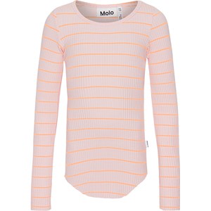 Ljus korallfärgad långärmad tröja med orangea neon ränder i mjuk ekologisk, stretchig, ribbstickad bomull. Tröjan har en tight passform och rund hals. Råa kanter vid båda ärmar och hål för tummen. En genomgående lodrät söm mitt på ryggen och en rå avrundad kant nertill.