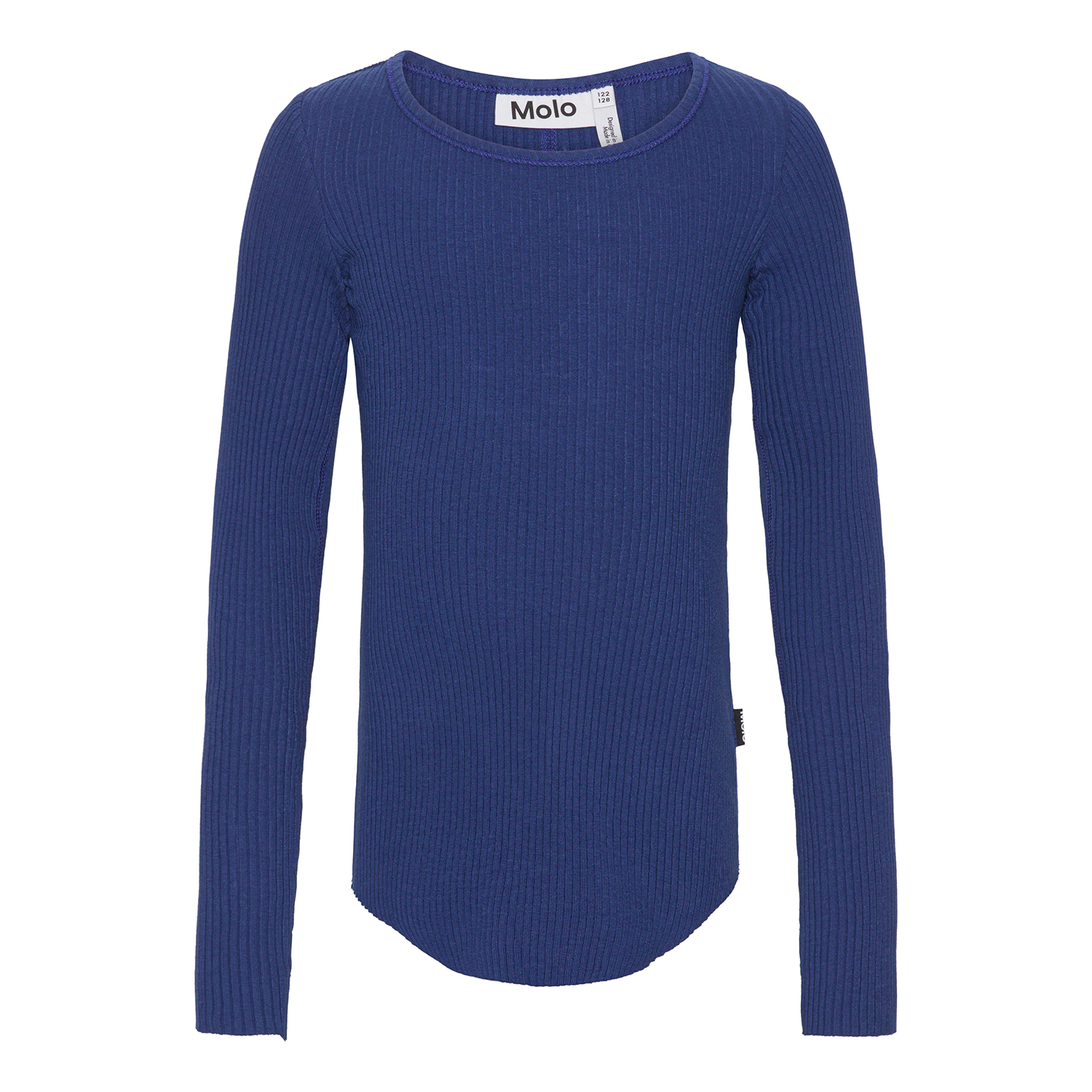 Blå långärmad tröja i mjuk ekologisk, stretchig, ribbstickad bomull. Tröjan har en tight passform och rund hals. Råa kanter vid båda ärmar och hål för tummen. En genomgående lodrät söm mitt på ryggen och en rå avrundad kant nertill.