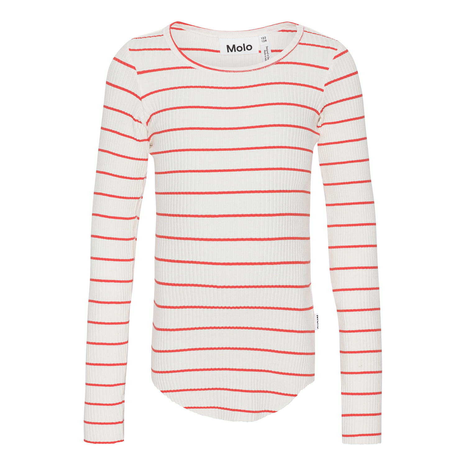 Röd- och vitrandig långärmad tröja i mjuk ekologisk, stretchig, ribbstickad bomull. Tröjan har en tight passform och rund hals. Råa kanter vid båda ärmar och hål för tummen. En genomgående lodrät söm mitt på ryggen och en rå avrundad kant nertill.