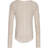 Off-white långärmad topp i stretchig ekologisk bomullsribb med en tight passform, rund hals, råa kanter på båda ärmarna med tumhål. Toppen har en vertikal söm som löper ner längs mitten av ryggen och en rå, rundad nederkant.