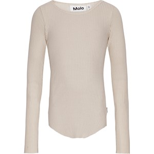Off-white långärmad topp i stretchig ekologisk bomullsribb med en tight passform, rund hals, råa kanter på båda ärmarna med tumhål. Toppen har en vertikal söm som löper ner längs mitten av ryggen och en rå, rundad nederkant.