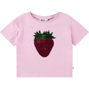 Oversized rosa T-shirt i ekologisk bomull med ribbad halsringning. T-shirten har en vändbar paljettjordgubbe på framsidan.