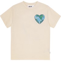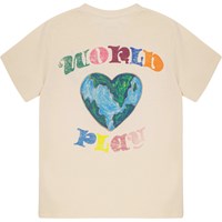 Off-white T-shirt i ekologisk bomull med korta ärmar, rund hals och ribbstickad kant. Den har en normal passform, ett främre tryck av jorden formad som ett hjärta och samma design på baksidan med en flerfärgad text som säger "World Play".
