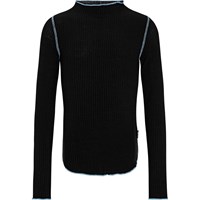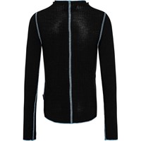 Långärmad svart tröja i mjuk viskos med en tight passform, rund hals och ljusblå overlockkanter på ärmarna, axlarna, baksidan och nederkanten av blusen.