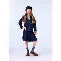 Underbar blå kofta i ekologisk bomull. Koftan har en V-ringning, en fin krage, knäppning framtill och små fickor. Kombinera den med den matchande kjolen.