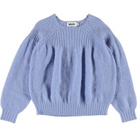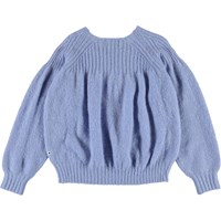 Gabriela är en lila stickad blus med rund hals och volym i ärmarna.