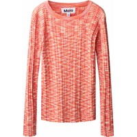 Långärmad tröja i en viskosblandning. Tröjan är ribbad med en åtsittande silhuett, en rund halsringning och råa kanter runt ärmarna och midjan. Tröjan är vävd i orange och vita färger, vilket ger en fin textur.