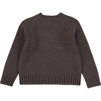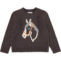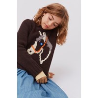Gaia är en mörkbrun stickad tröja med en söt häst framtill.