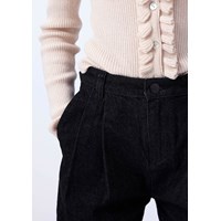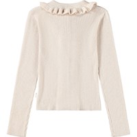 Vacker, krämvit åtsittande kofta i en blandning av ull och bomull. Koftan har en fin krage med volanger, samt volanger längs knäppningen på båda sidor. Koftan har ett ribbat mönster och vackra knappar i pärlemor.