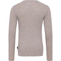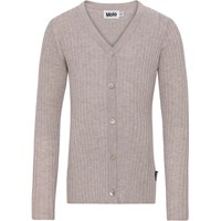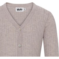 Genie är en tunn och fin stickad kofta i grått med rosa nyans. Tröjan har en v-ringning och pärlemorknappar. Genie är mjuk eftersom den innehåller kashmir.