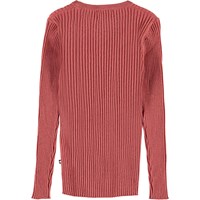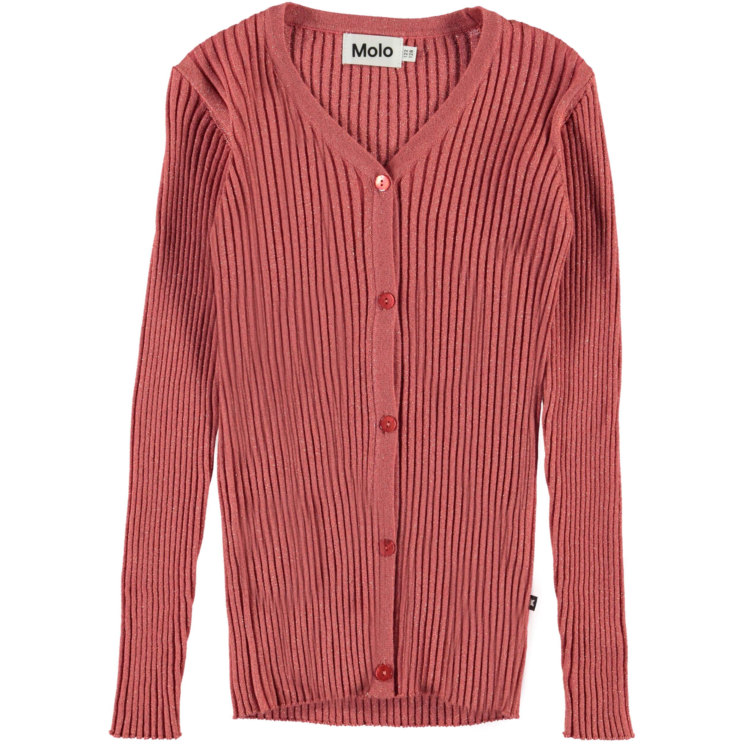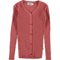 Genie är en mörkrosa ribb cardigan med bra längd och knappknäppning framtill. Cardiganen har v-ringning och är i 100% bomull med glitter i.