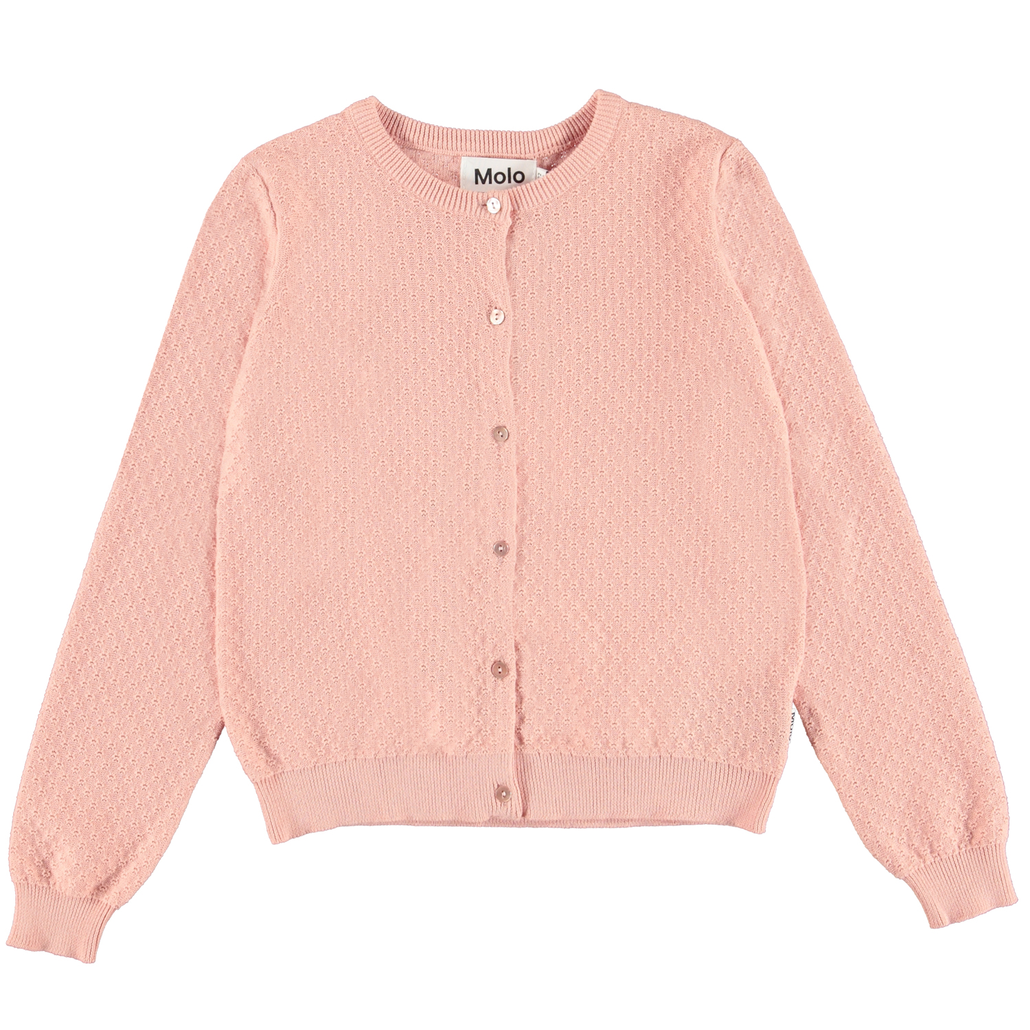 Georgina är en rosa bomullskofta med knappar framtill.
