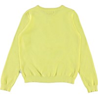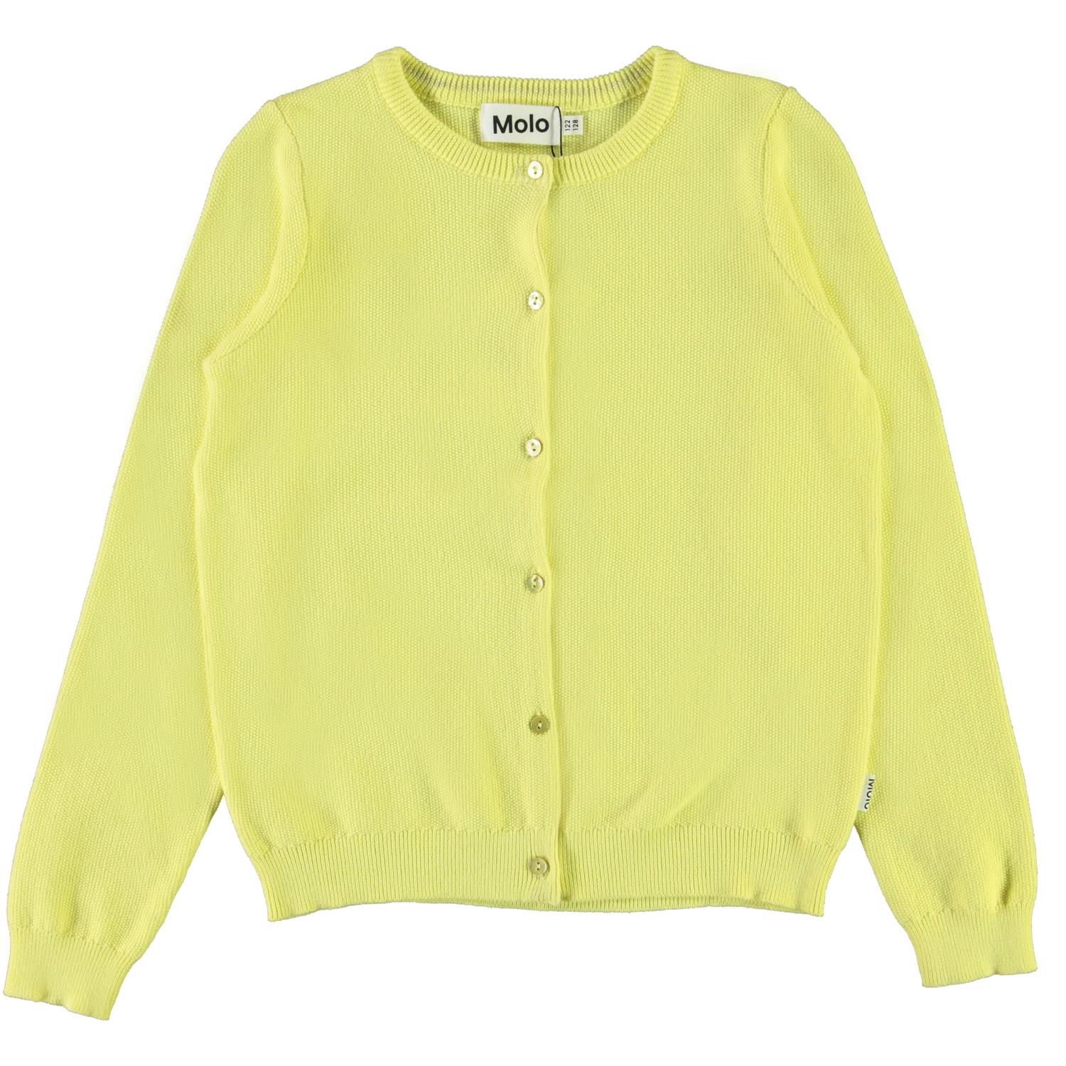 Georgina är en gul bomullströja. Koftan är i ett finstickat mönster och har knappstängning.