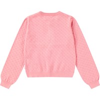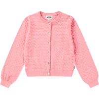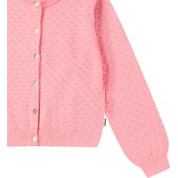 Rosa stickad kofta i ekologisk bomull med ett delikat stickat mönster. Koftan har knappar och fina ribbade kanter vid halsen, ärmsluten och midjan. Den är stretchig och ger gott om rörelsefrihet.