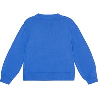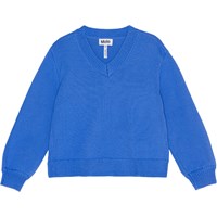Blå stickad sweater i mjuk bomull. Tröjan har v hals, stickade ribbkanter vid hals, ärmar och nertill och en lös passform som gör den skön att ha på.