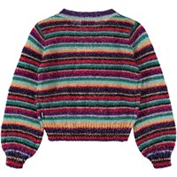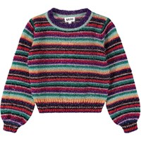 Multifärgad, randig och fluffig tröja. Tröjan har långa ballongärmar och ribbade kanter runt halsen, ärmarna och midjan.