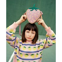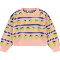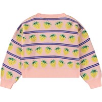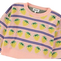 Rosa stickad tröja i mjuk ekologisk bomull med en rund halsringning, ribbad kant vid halsen, ärmar och nederkant på tröjan. Tröjan har en oversize passform med ränder och gula jordgubbar.