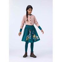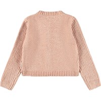 Roséfärgad kofta i chenillegarn. Denna kofta har knäppning framtill och ribbade kanter på hela ärmen, runt halsen och midjan.