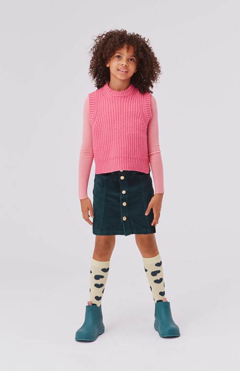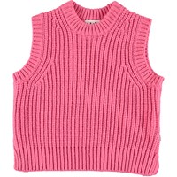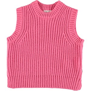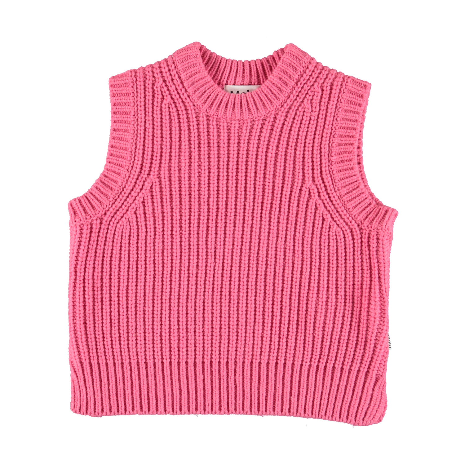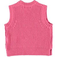 Gilberte är en rosa stickad väst. Västen har rund hals och små slitsar i sidorna.
