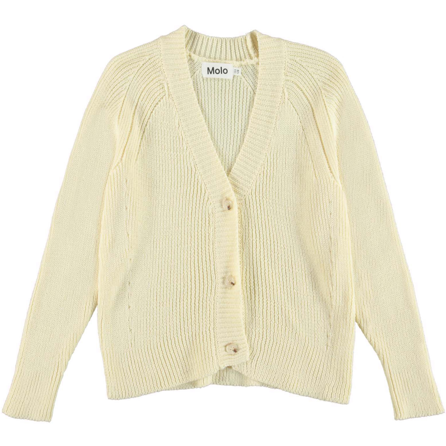 Gilda är en pärlemorfärgad stickad kofta med v-hals, kortare passform och knappar.