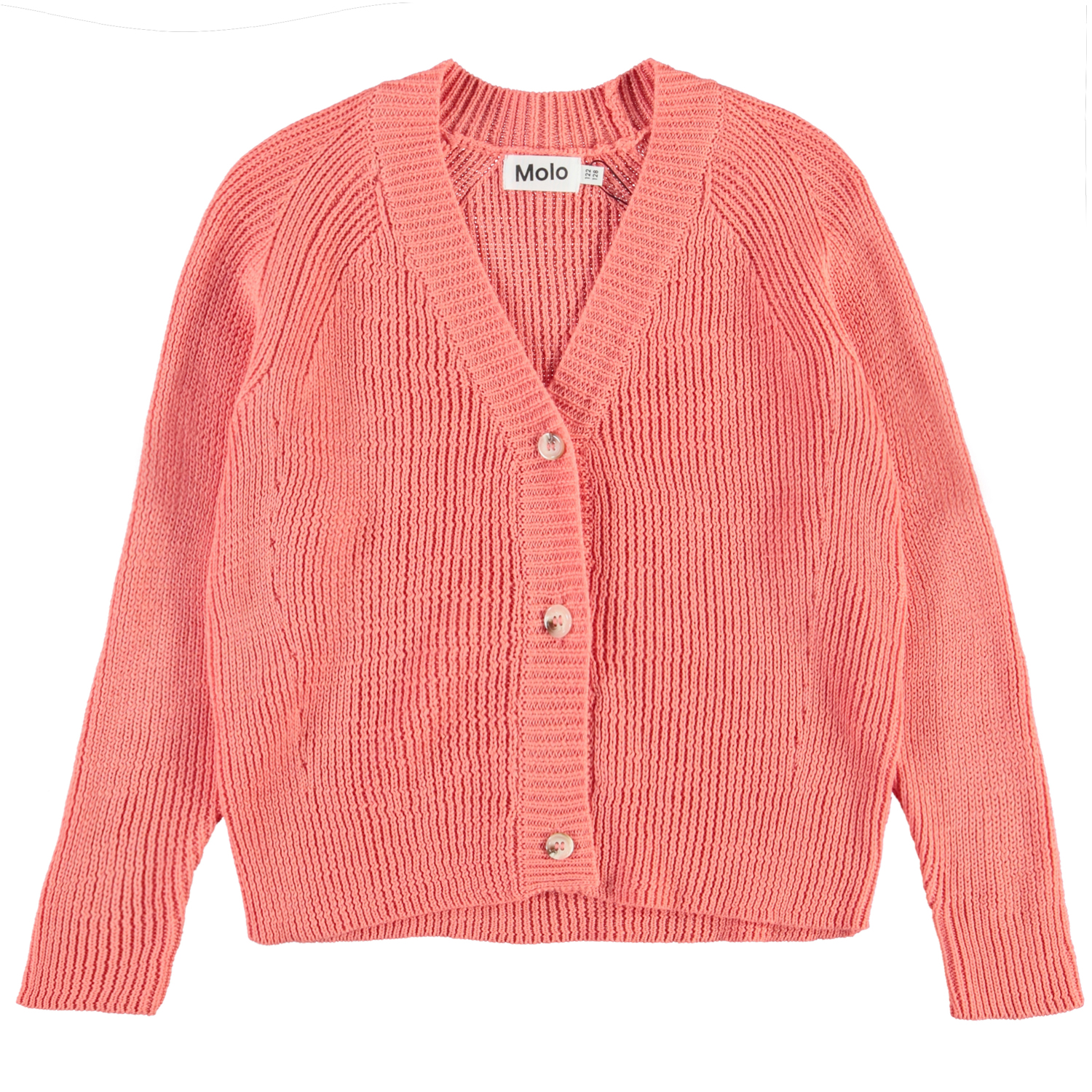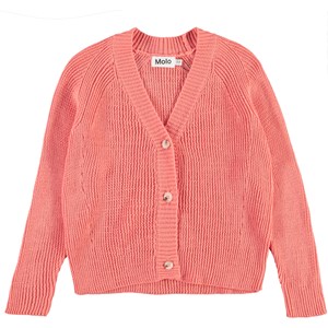Gilda är en korallfärgad stickad kofta med v-hals, kortare passform och knappar.
