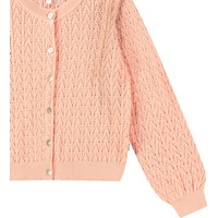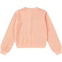 Ljusorange stickad kofta i mjuk ekologisk bomull med ett vackert spetsmönster. Koftan har en normal passform, pärlknappar framtill och ribbade kanter vid halsen, ärmsluten och nederkanten på koftan.