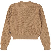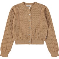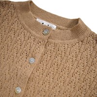 Klassisk brun kofta i ull och bomull. Denna kofta har ett vackert spetsmönster, pärlknappar framtill och ribbade kanter runt halsen, ärmsluten och midjan.