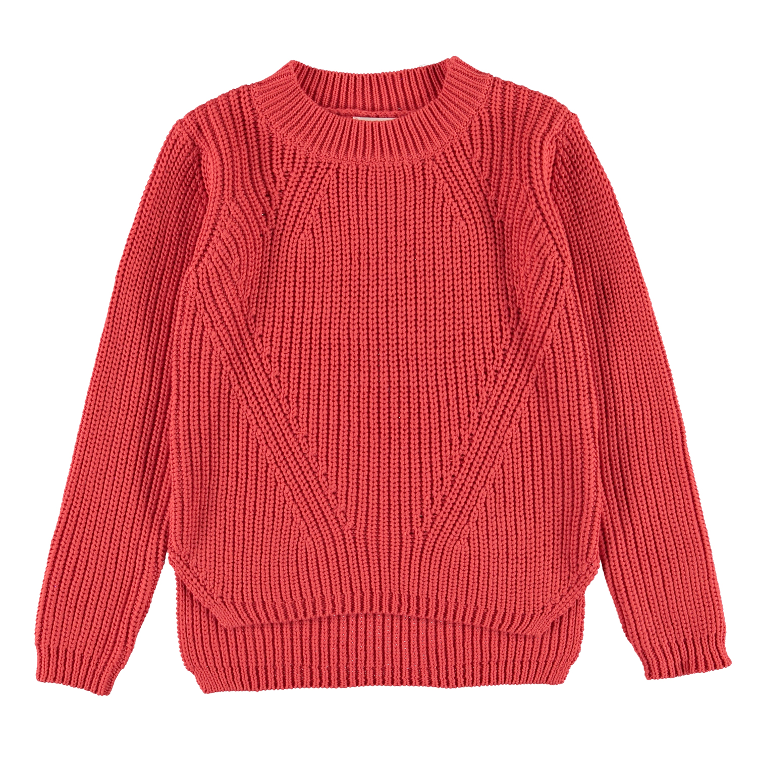 Gillis är en röd stickad bomullströja. Tröjan har rund hals och fint stickat mönster.