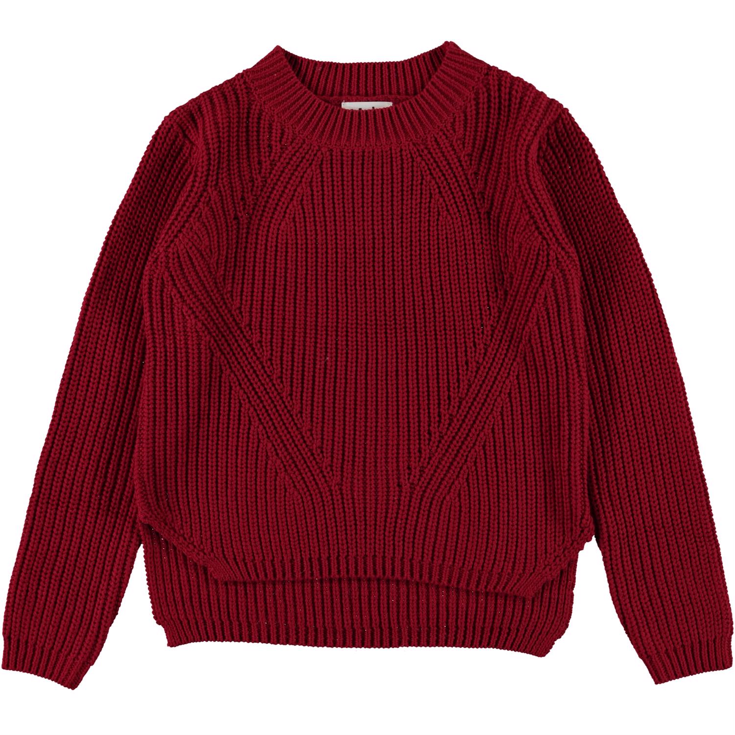 Gillis är en mörkröd stickad tröja med långa ärmar. Tröjan har en rund hals och ett fint stickat mönster. Tröjan är gjord av 100% ekologisk bomull.