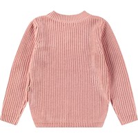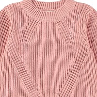Rosa stickad tröja i mjuk ekologisk bomull med en rund halsringning. Tröjan har en lös passform, är ribbstickad med delikata ökningar och minskningar, har extra längd baktill och slitsar i sidorna.