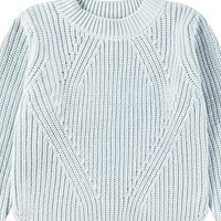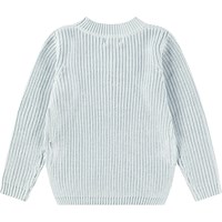 Ljusblå stickad tröja i mjuk ekologisk bomull med en rund halsringning. Tröjan har en lös passform, är ribbstickad med delikata ökningar och minskningar, har extra längd baktill och slitsar i sidorna.