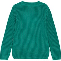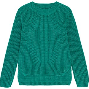 Grön långärmad stickad tröja i mjuk ekologisk bomull. Tröjan är stickad i ribbstickning med fint mönster. Den har extra längd i ryggen och sidslitsar för extra stil och komfort.