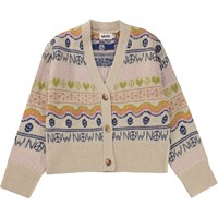 Råvit stickad kofta med nordiskinspirerat mönster. Mönstret består av små smileys, hjärtan och peacetecken och budskapet "Pecae Now" i olika färger. Denna kofta 'r tillverkad i en mjuk och varm ull blandning, har V-hals, knappar framtill, långa ärmar med ribbkant, ribbkant vid höften och en lös passform. Perfekt som ett extra lager på de kallare dagarna.