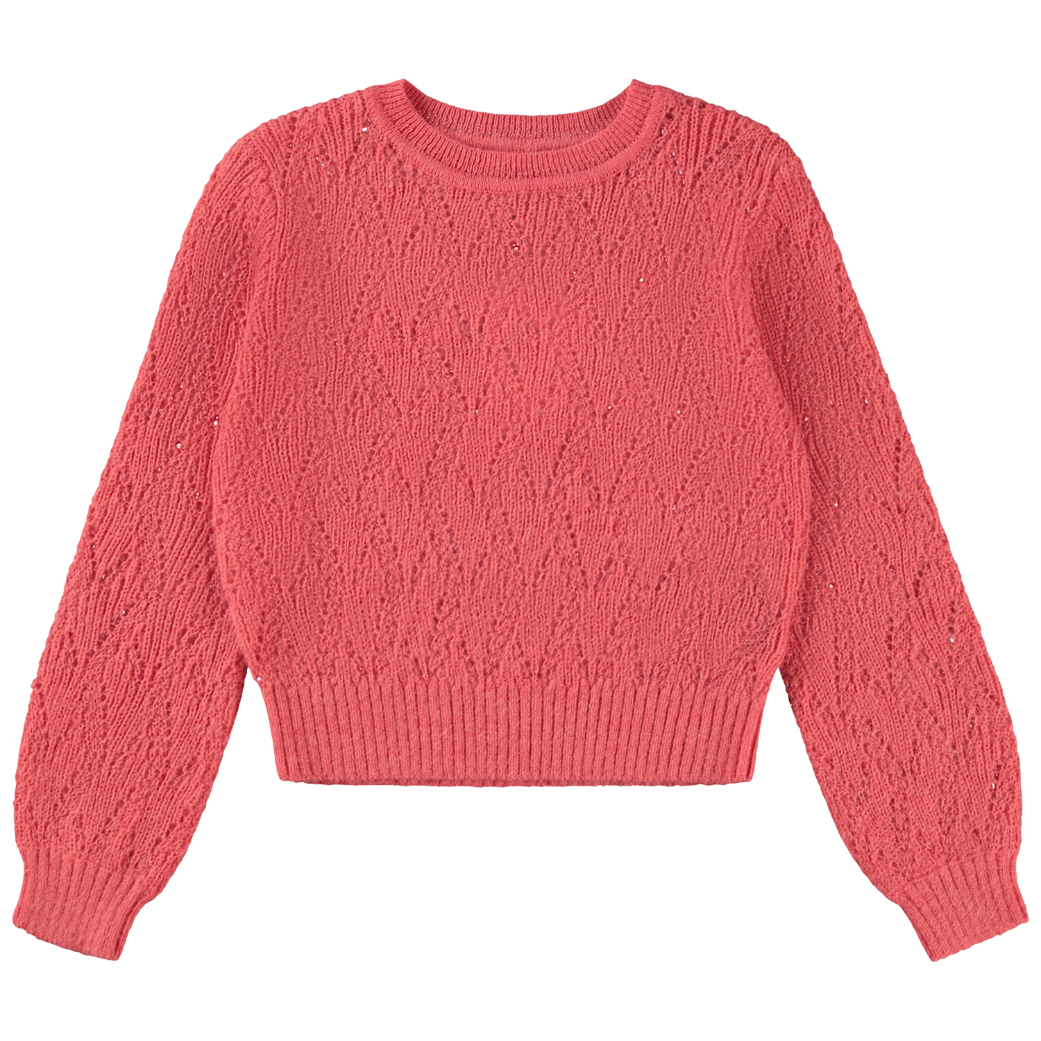 Rosa stickad tröja med hålmönster. Denna stickade tröja ät tillverkad i en alpaca/ull blandning, har ett fint hålmönster, långa örmar med volym, rund hals med ribb, ribbkanter vid ärmar och höfter och en normal passform. Den perfekta vardagströjan.