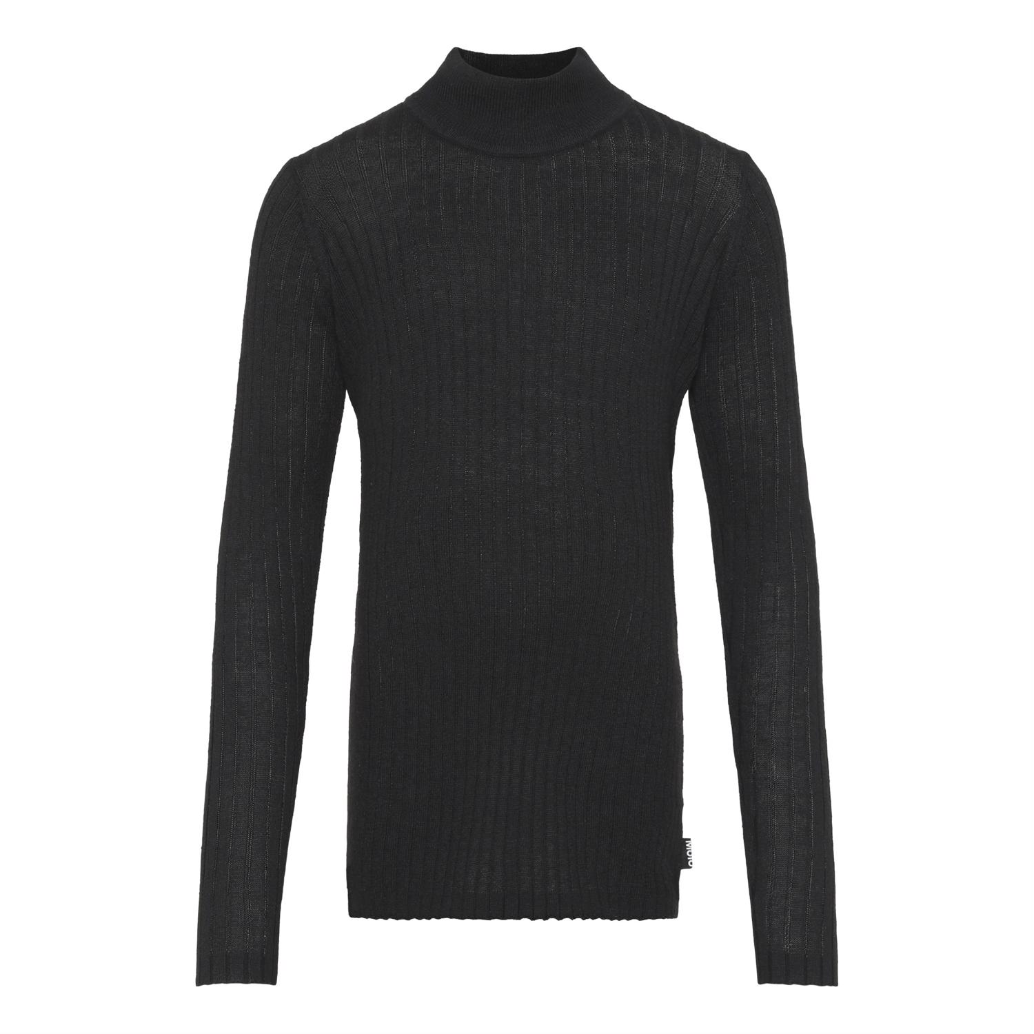 Gitte är en svart stickad tröja hög hals och ett fint ribbmönster. Tröjan är fin och mjuk eftersom den innehåller kashmir.