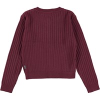 Gloria är en mörkröd stickad kofta med kort passform. Koftan har knappar framtill.