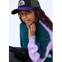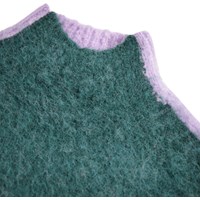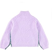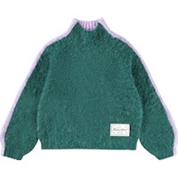 Fluffig stickad tröja i en blandning av alpackaull. Tröjan är tvåfärgad i lila och grön med en fin etikett med texten ''Humankind - Being Kind to Humankind''. Tröjan har en hög hals och ribbade kanter runt halsen och ärmarna.