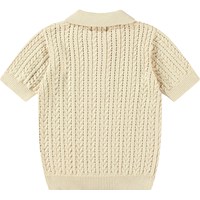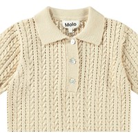 Off-white stickad t-shirt i mjuk ekologisk bomull. T-shirten har en klassisk krage, ribbade kanter på ärmarna, nederkanten av t-shirten och knappslån, som har tre pärlknappar. T-shirten är stickad i ett vackert spetsmönster, vilket ger den en exklusiv look.