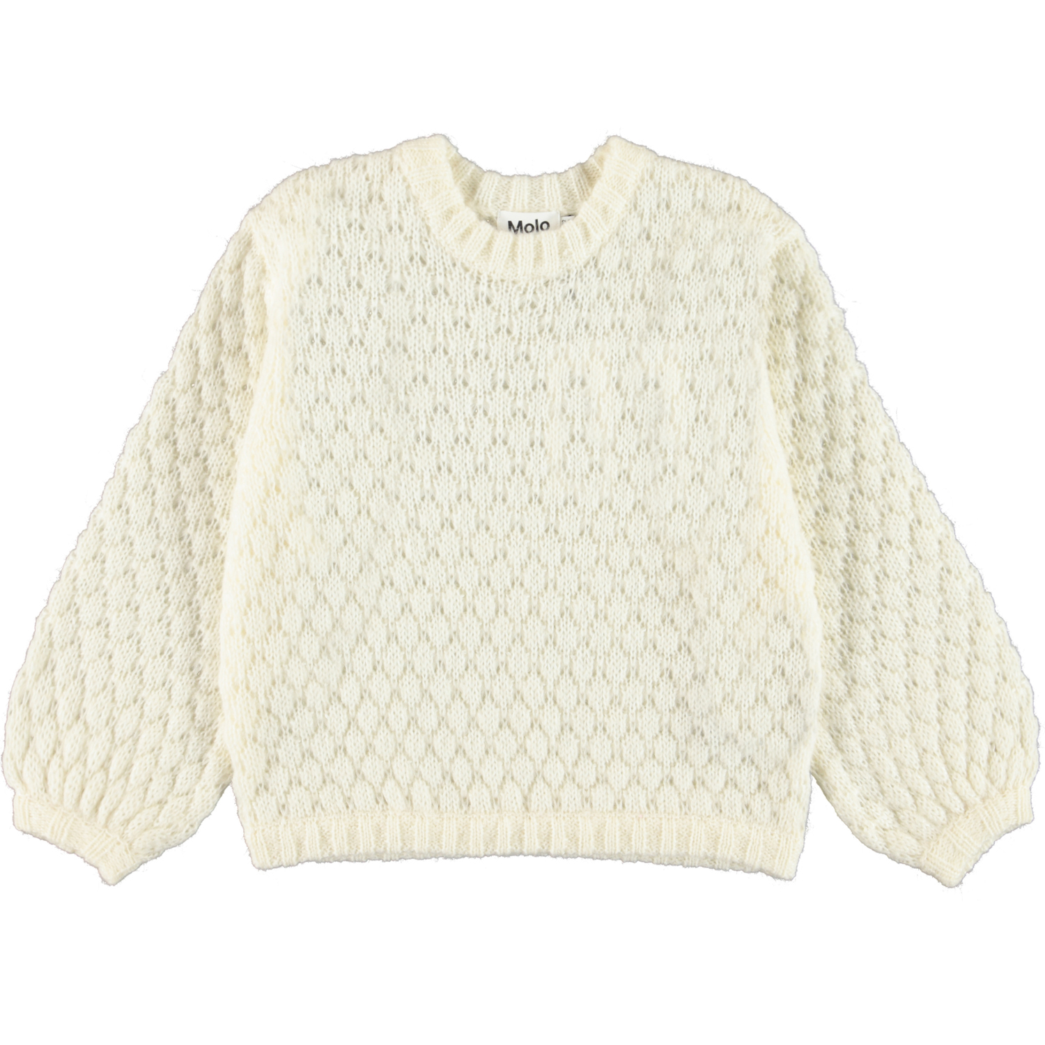 Gulia är en ljus stickad töja med fint hålmönster. Tröjans ärmar har en fin klockad form.